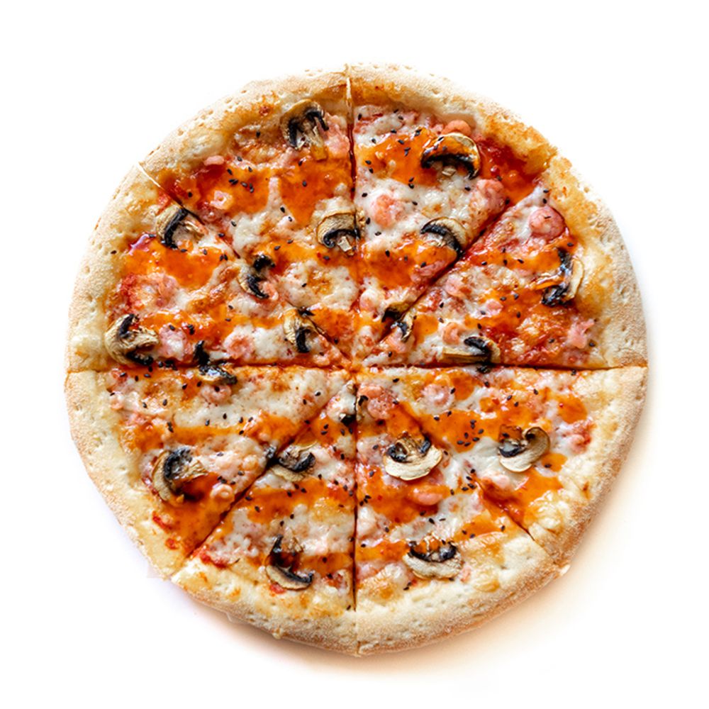 Томатный соус, сыр «Моцарелла», шампиньоны, креветки, кисло-сладкий соус, кунжут черный